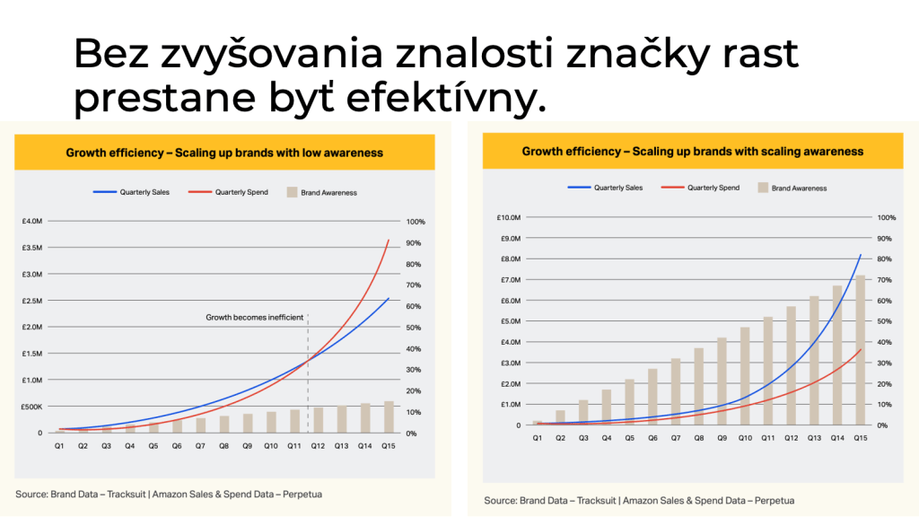 Vidíme, že rast tržieb bez rastu znalosti značky začne byť od určitého momentu neefektívny. (Rast znalosti značky je výsledkom hlavne reklamy, ktorú ľudia zachytia a zapamätajú si branding).