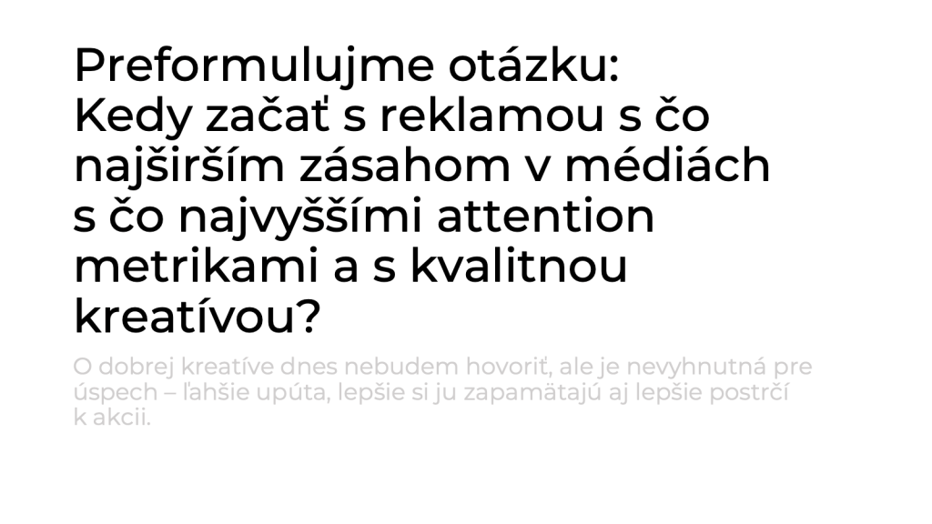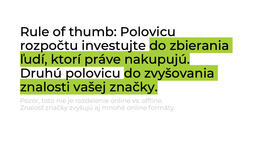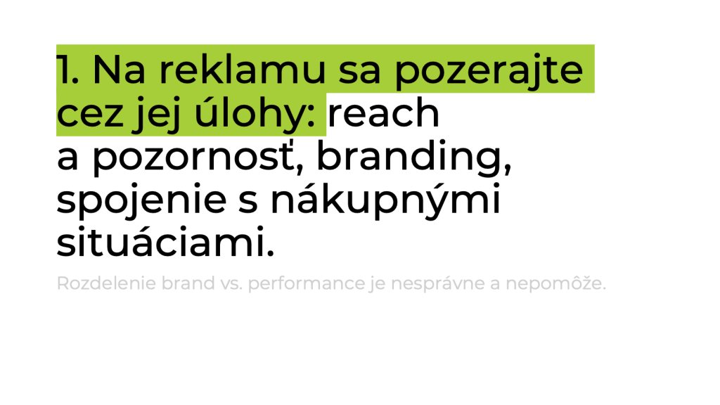 A povedali sme si, že niektoré médiá a formáty reklám majú slabé metriky pozornosti a málo priestoru na branding. Preto dokážu zbierať ľudí, ktorí chcú nakupovať produkty kategórie, ale nedokážu dobre zvyšovať mentálnu dostupnosť značky.