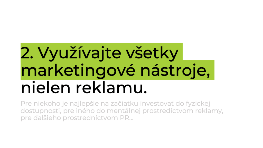 Univerzálna stratégia neexistuje. Môžete vojsť na nudný stabilný trh a rozbiť ho produktovou inováciou spojenou s výbornou kreatívou. Môžete skopírovať existujúci produkt na trhu s vysokým potenciálom, ktorí konkurenti nevidia, a preto majú podinvestovaný marketing. Môžete zvýšiť fyzickú dostupnosť a kombinácia so zvýšenou mentálnou vám umožní rýchly rast. Alebo môžete zásah budovať cez PR, vďaka čomu sa o vás dozvedia partneri, ktorí vás potiahnu cez ich médiá.