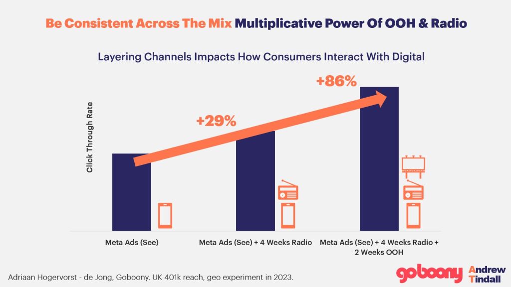 Nižšie je príklad pokusu z Veľkej Británie, kde v porovnateľne veľkých mestách experimentovali s média mixom. V jednom spustili len reklamu v médiách Mety, v ďalšom pridali rozhlas a v treťom pridali aj outdoor. Offline médiá spôsobili, že ľudia viac klikali na online reklamy.